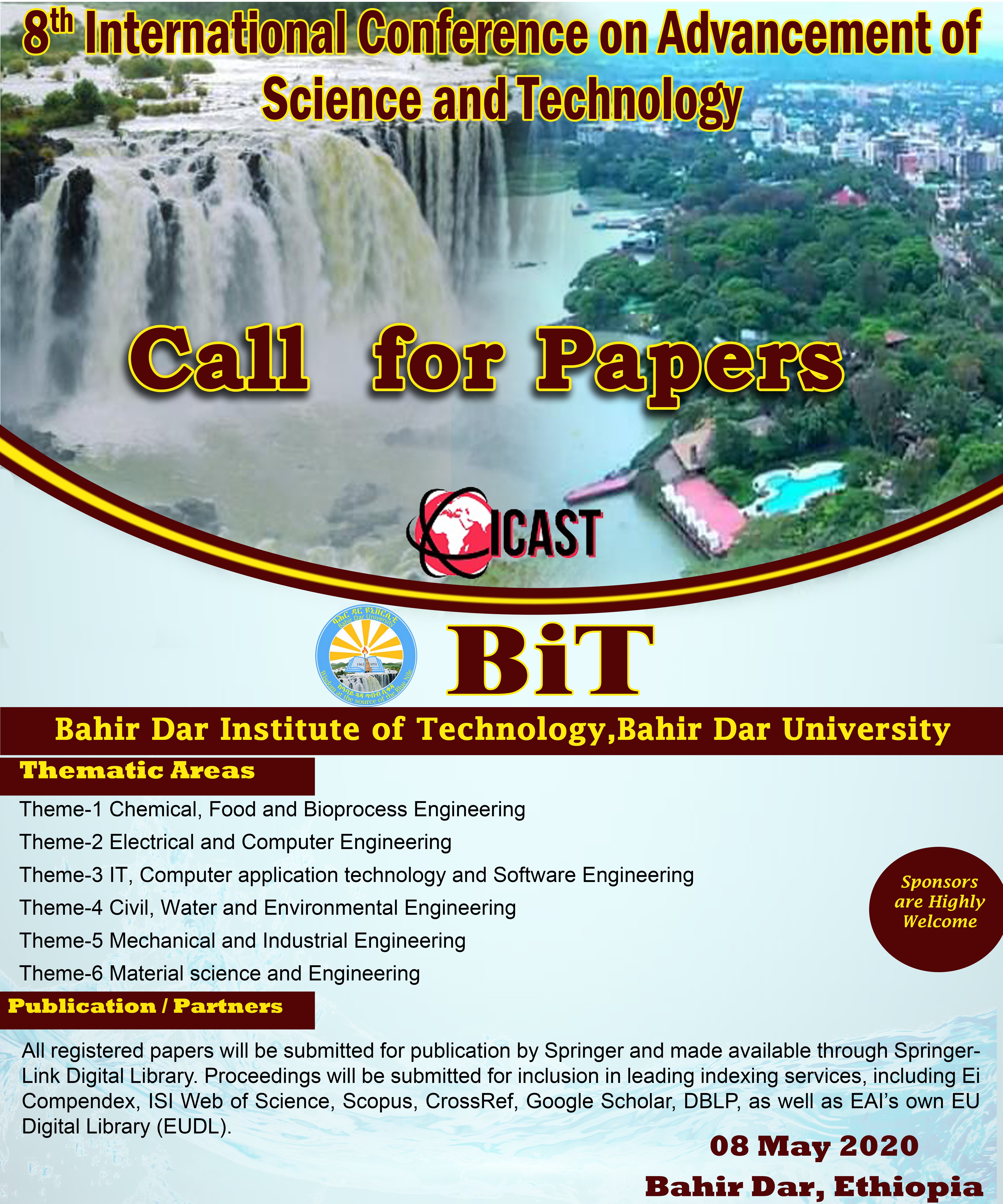 The conference will be held on May 8-10, 2020 in Bahir Dar, Ethiopia. ICAST 2020 provides comprehensive platform for scientists, researchers in the academia and institutes, and experts from the industry to present the latest technological advancements, research findings, innovations, and applications in all aspects of science and technology.
